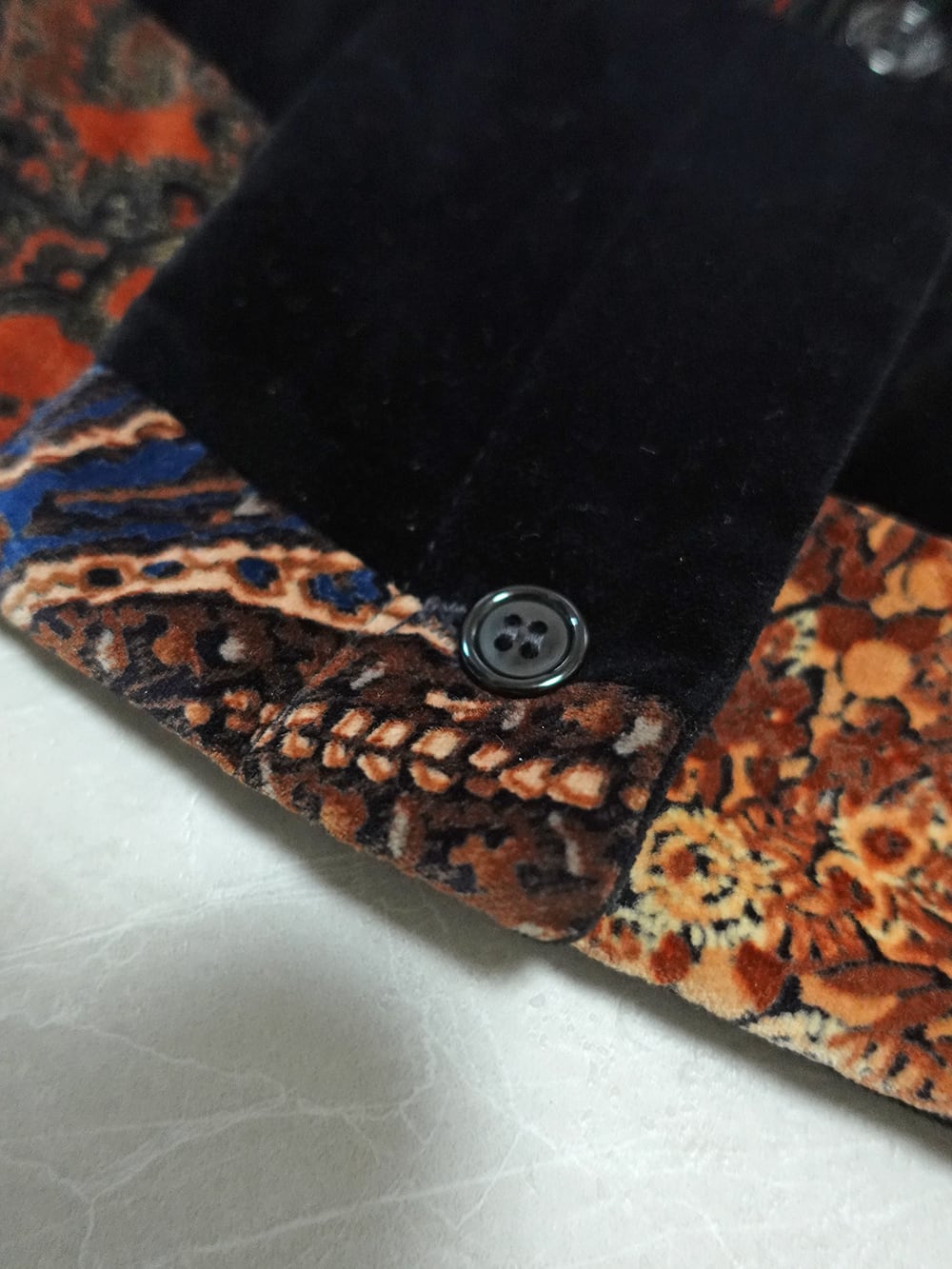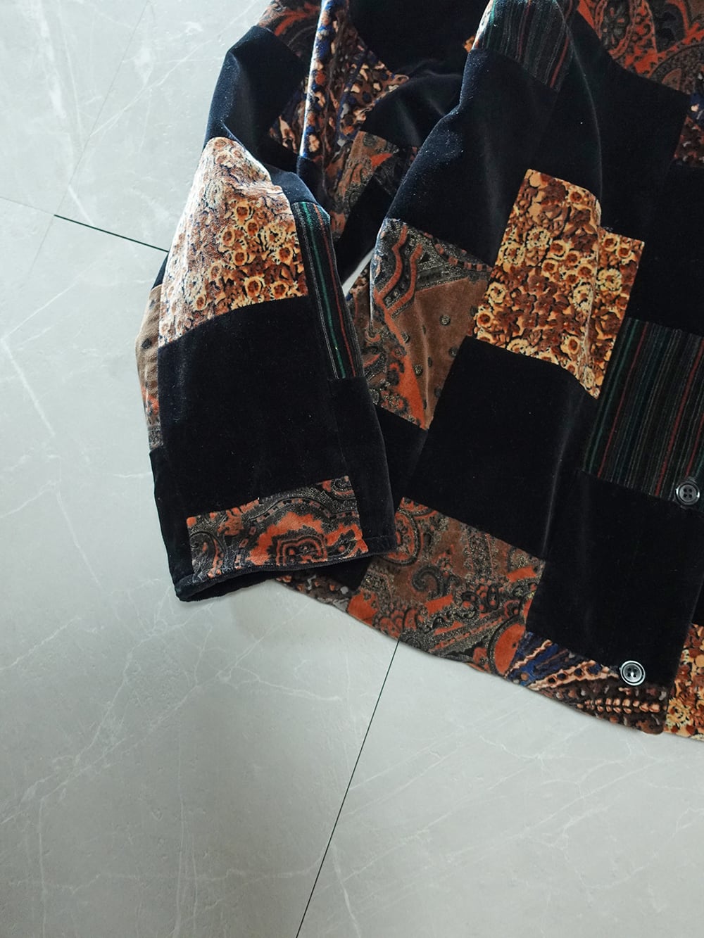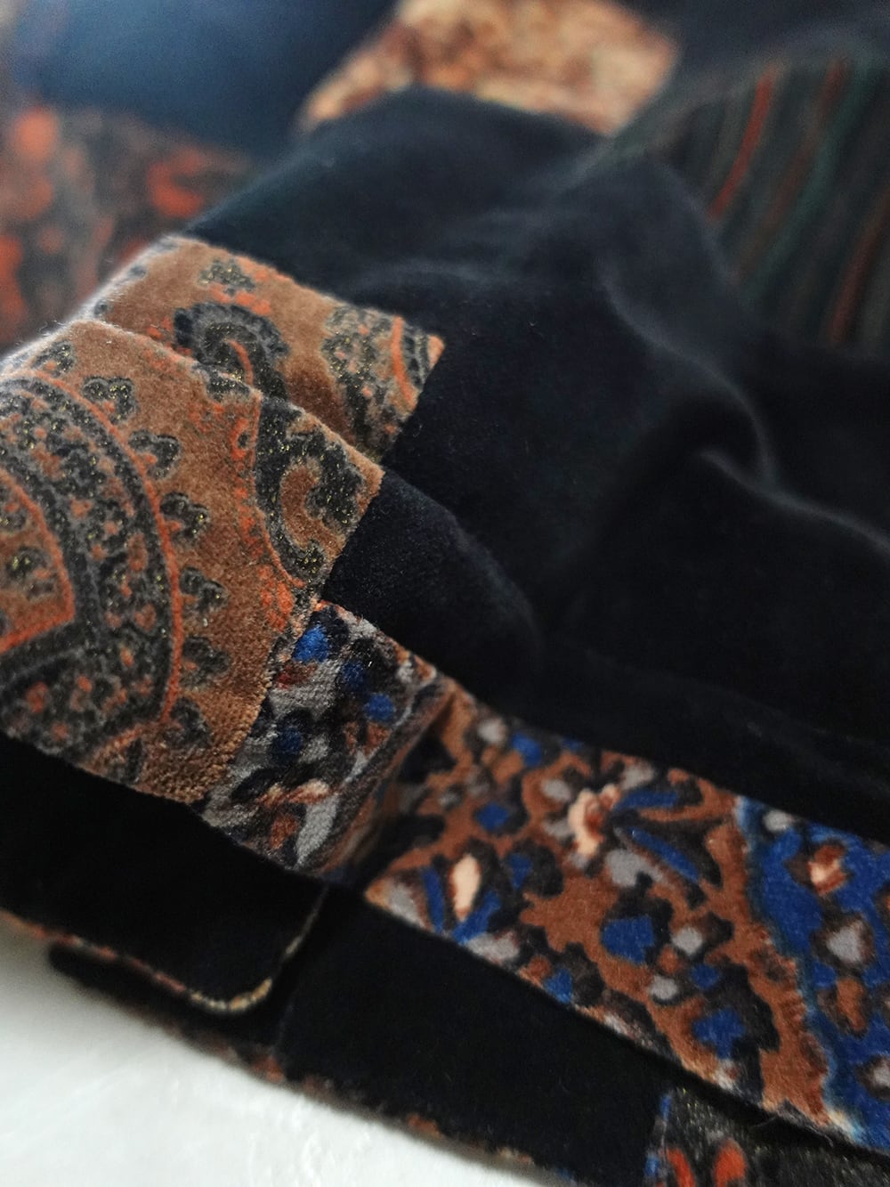 黒のベロアと様々な柄のパッチワーク。